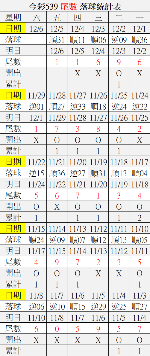 12/6 今彩539 落球順序表