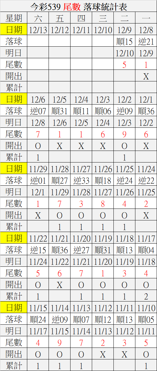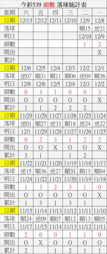 12/10 今彩539 落球順序表