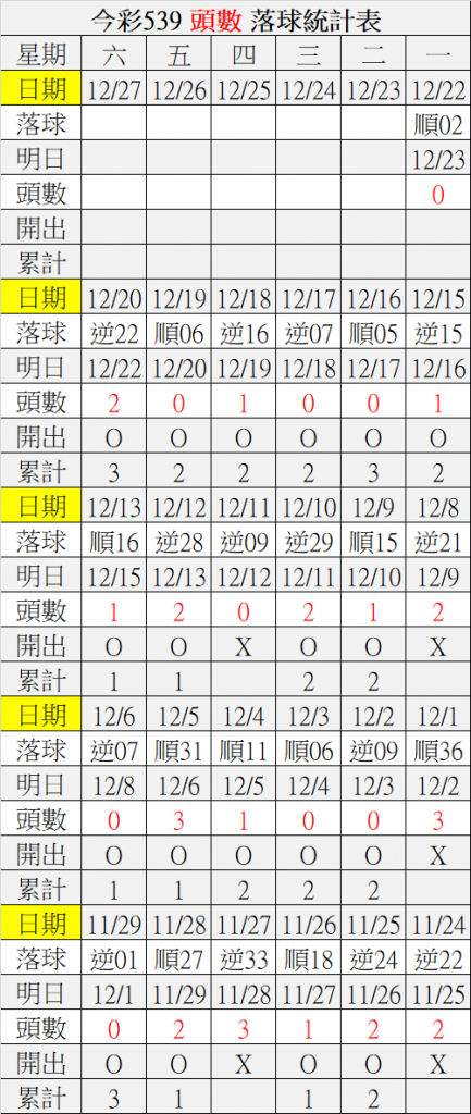 12/23 今彩539 落球順序表