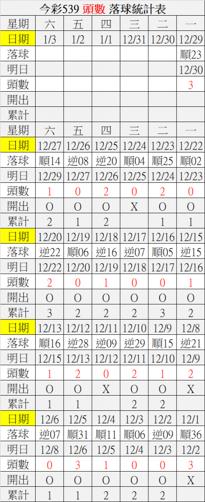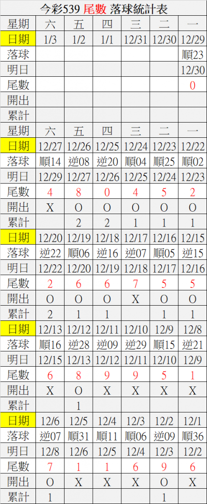12/30 今彩539 落球順序表