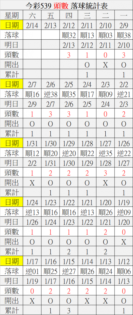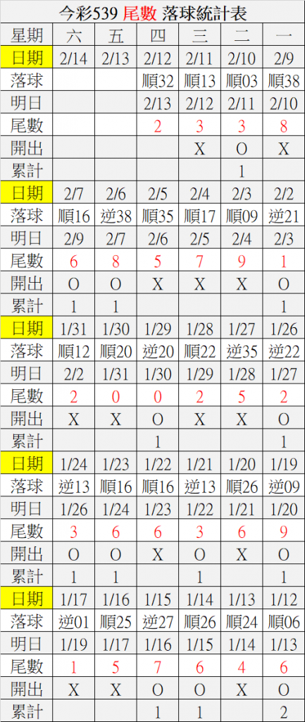 2/13 今彩539 落球順序表
