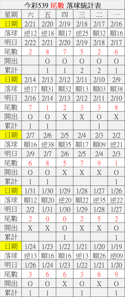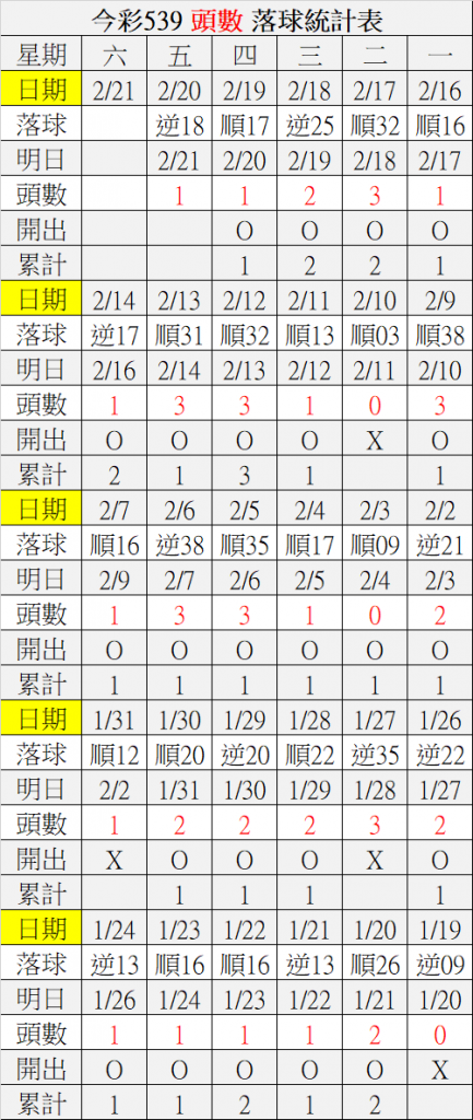 2/22 今彩539 落球順序表