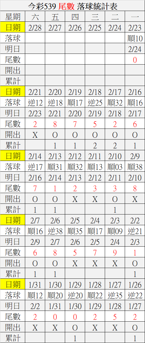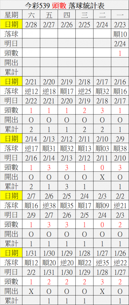 2/23 今彩539 落球順序表