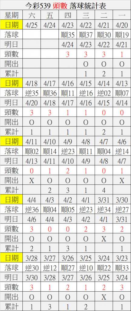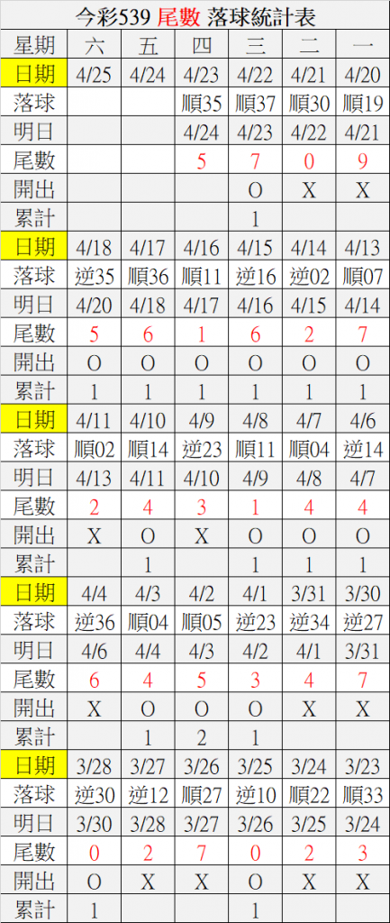 4/24 今彩539 落球順序表