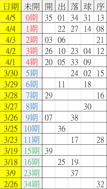 4/6 今彩539 遠星統計表