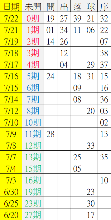 7/23 今彩539 遠星統計表