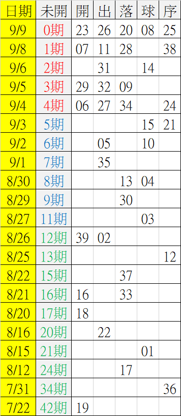 9/10 今彩539 遠星統計表