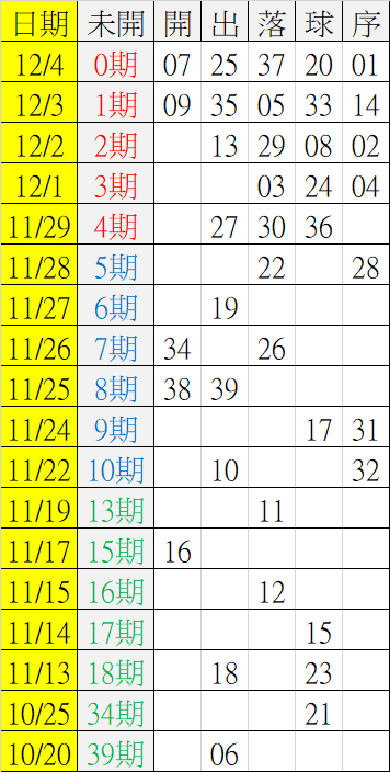 12/5 今彩539 遠星統計表