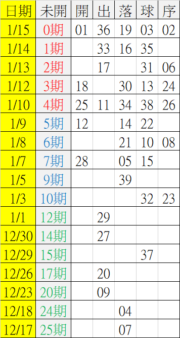 1/16 今彩539 遠星統計表