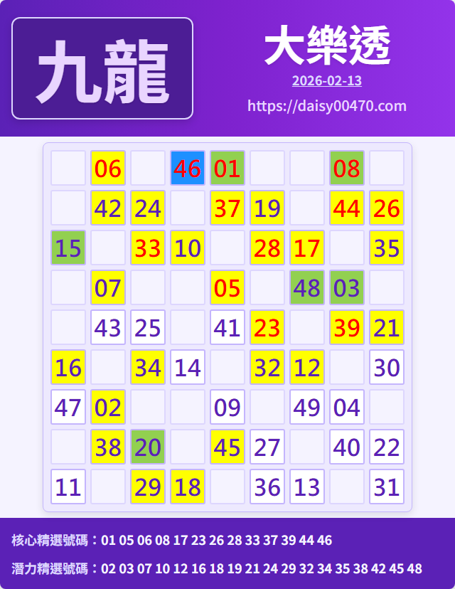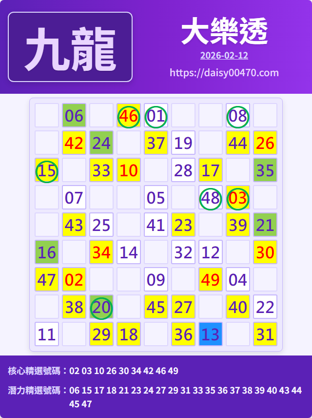 2/13 大樂透 九龍 精選 高機牌 合牌參考