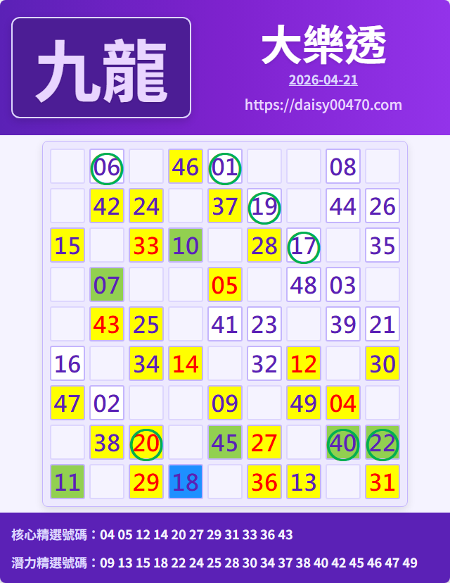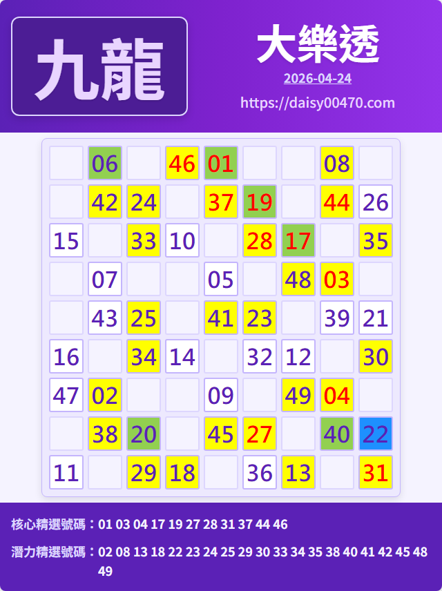 4/24 大樂透 九龍 精選 高機牌 合牌參考