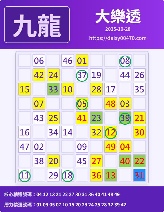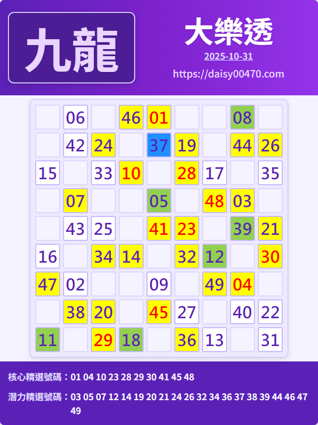 10/31 大樂透 九龍 精選 高機牌 合牌參考